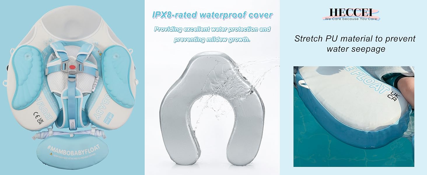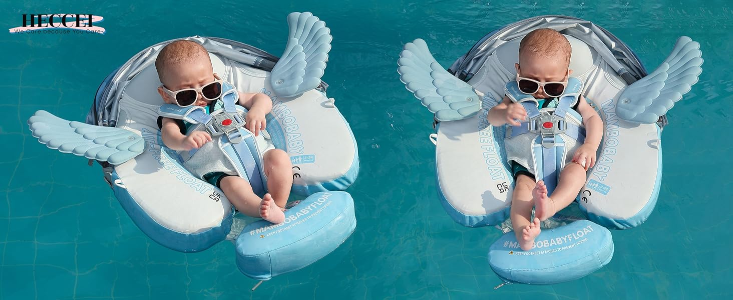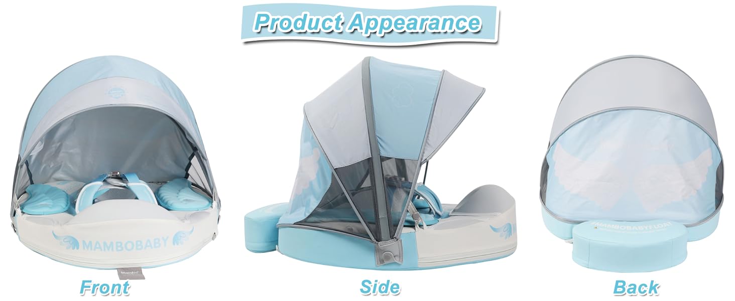 HECCEI Mambobaby Float comes with a removable canopy. The removable assemble UV-PROOF canopy sun canopy covered with UPF 50+ sunscreen coating protects baby’s skin away from the sun.
