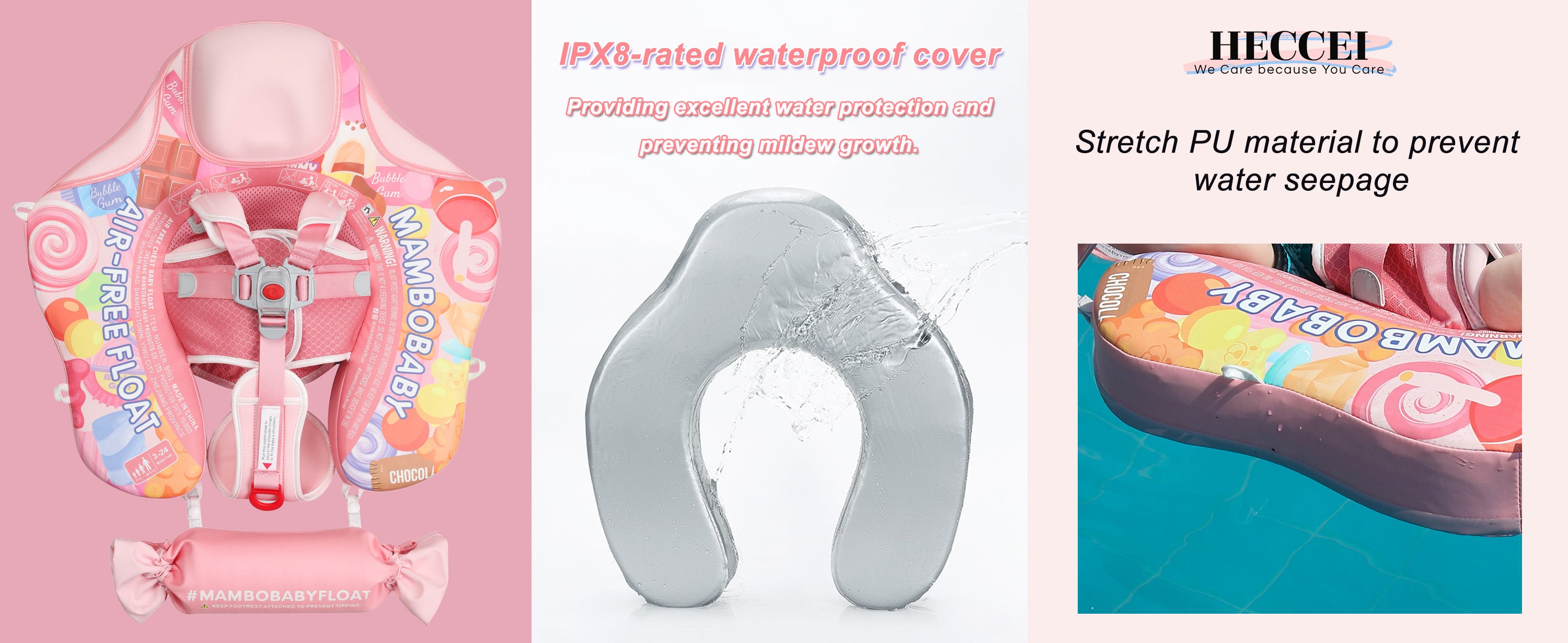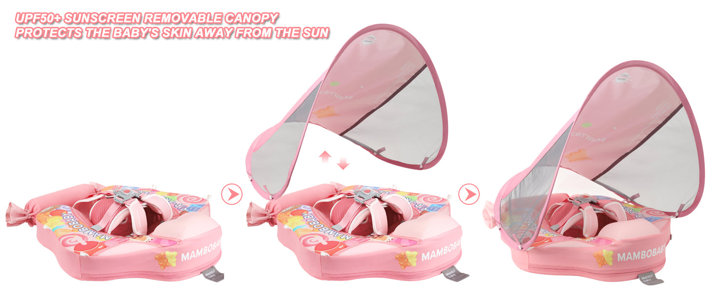HECCEI Mambobaby Float comes with a removable canopy. The removable assemble UV-PROOF canopy sun canopy covered with UPF 50+ sunscreen coating protects baby’s skin away from the sun.