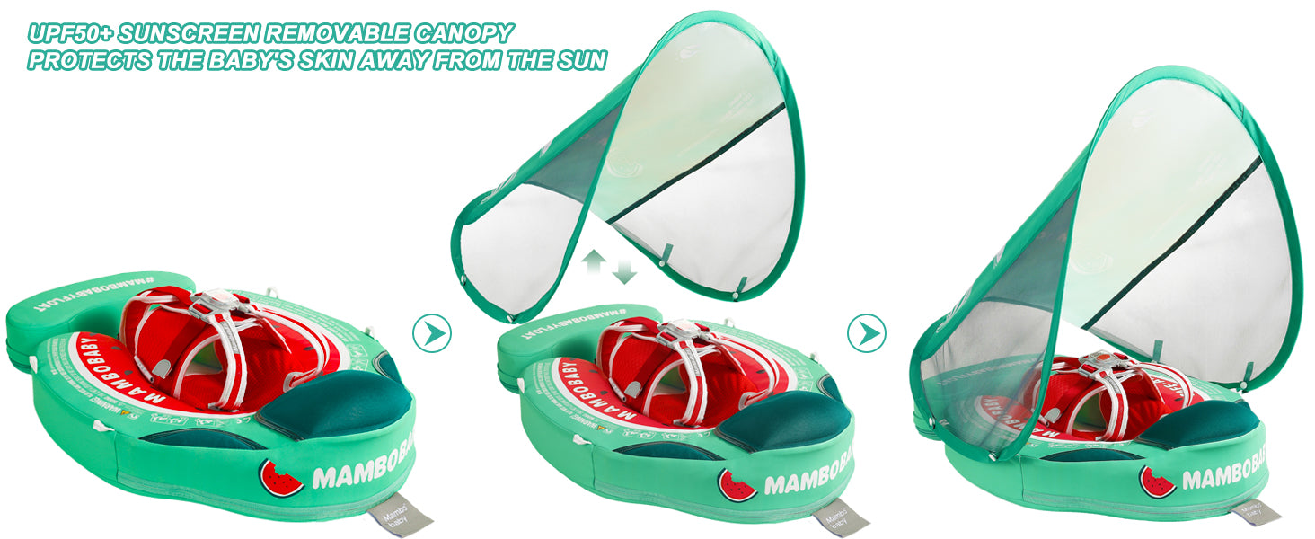 HECCEI Mambobaby Float comes with a removable canopy. The removable assemble UV-PROOF canopy sun canopy covered with UPF 50+ sunscreen coating protects baby’s skin away from the sun.