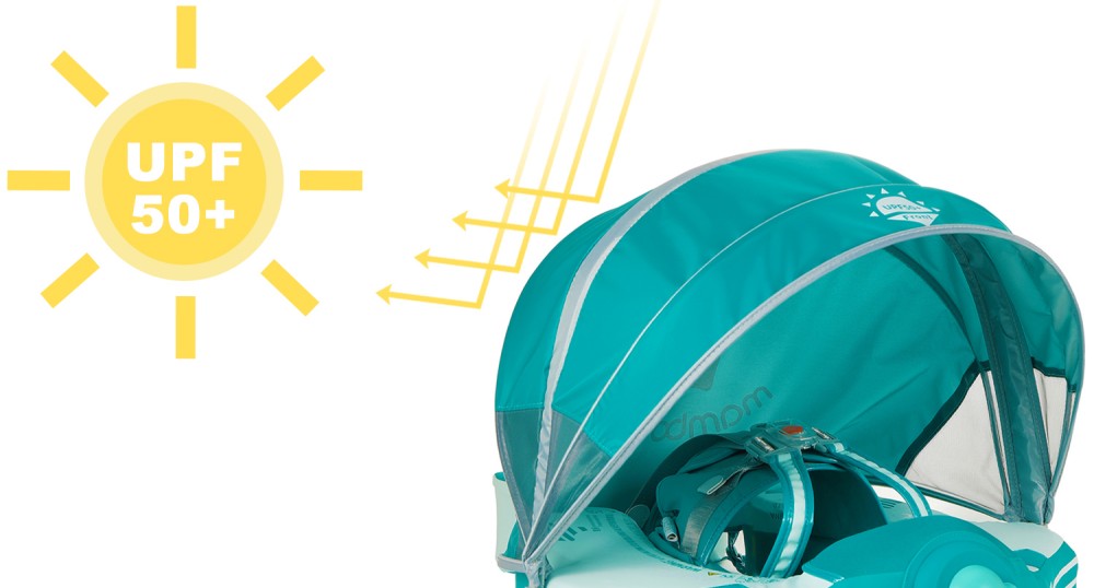 HECCEI Mambobaby Float comes with a removable canopy. The removable assemble UV-PROOF canopy sun canopy covered with UPF 50+ sunscreen coating protects baby’s skin away from the sun.
