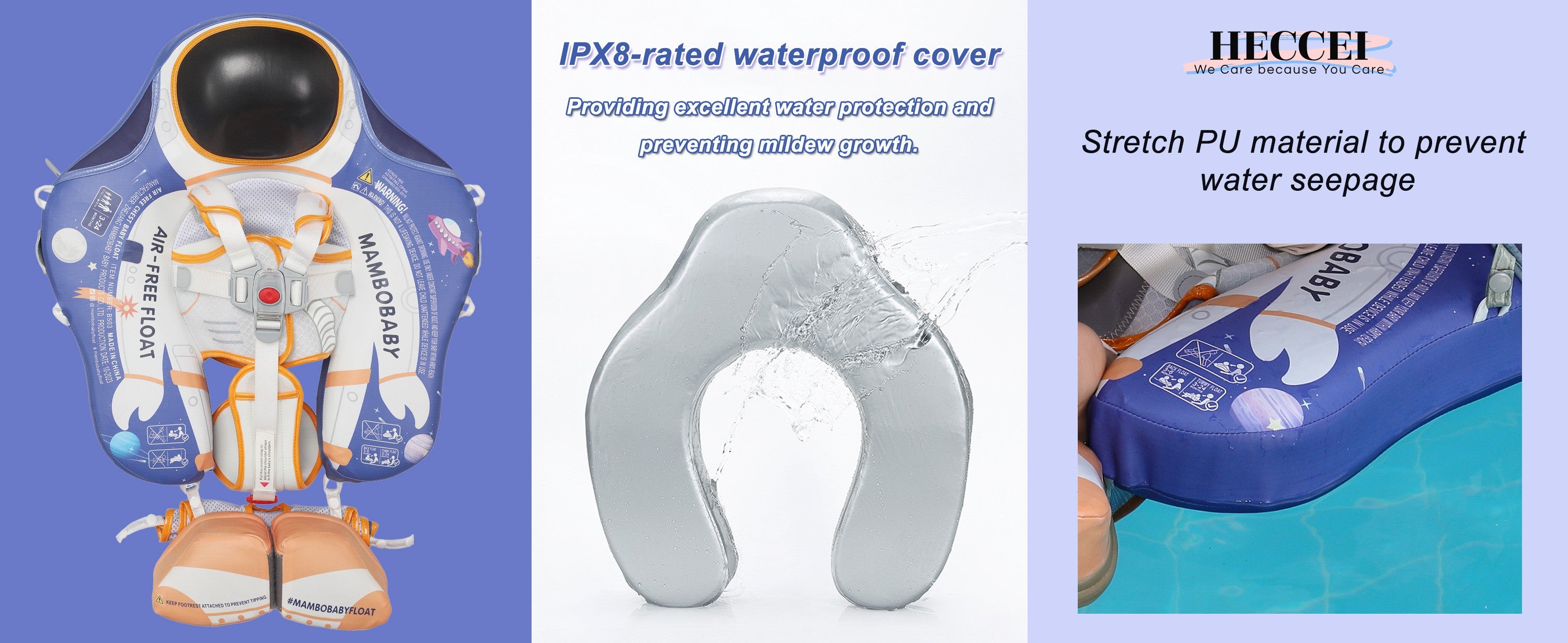 HECCEI Mambobaby Float comes with a removable canopy. The removable assemble UV-PROOF canopy sun canopy covered with UPF 50+ sunscreen coating protects baby’s skin away from the sun.