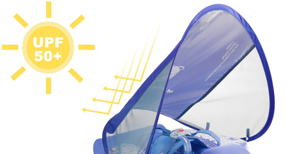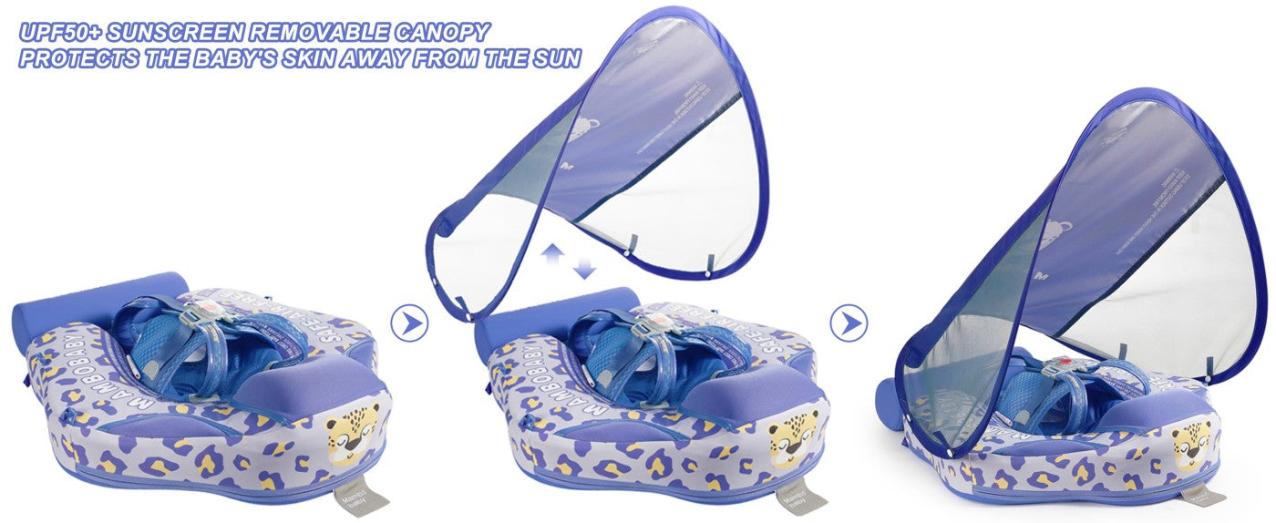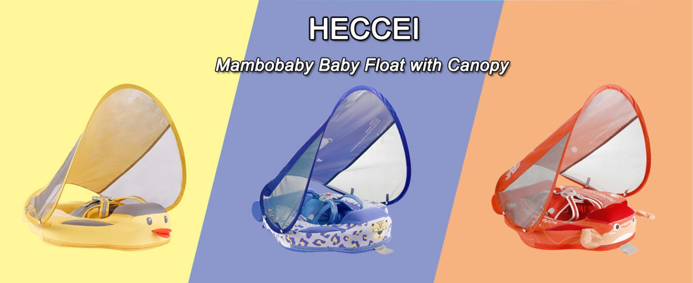 HECCEI Mambobaby Float comes with a removable canopy. The removable assemble UV-PROOF canopy sun canopy covered with UPF 50+ sunscreen coating protects baby’s skin away from the sun.