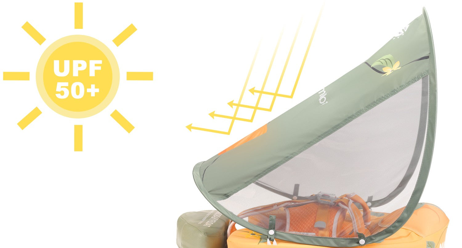 HECCEI Mambobaby Float comes with a removable canopy. The removable assemble UV-PROOF canopy sun canopy covered with UPF 50+ sunscreen coating protects baby’s skin away from the sun.