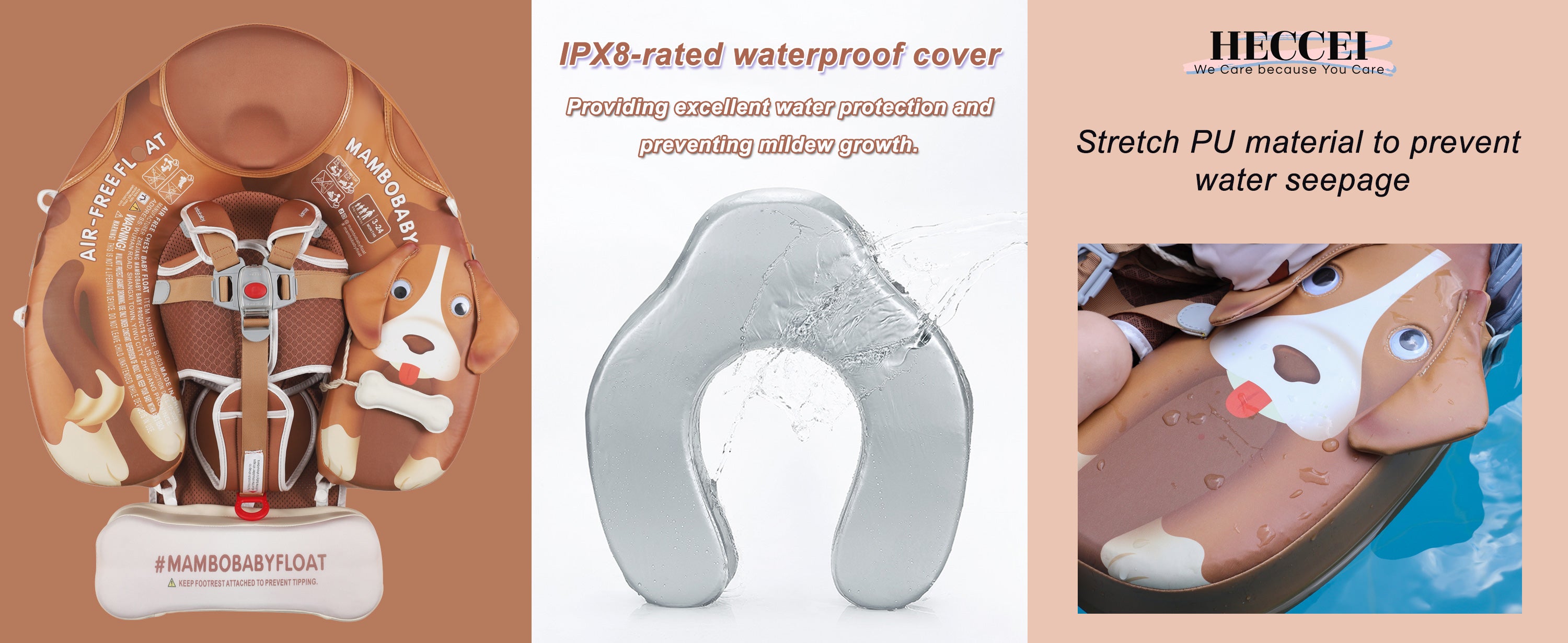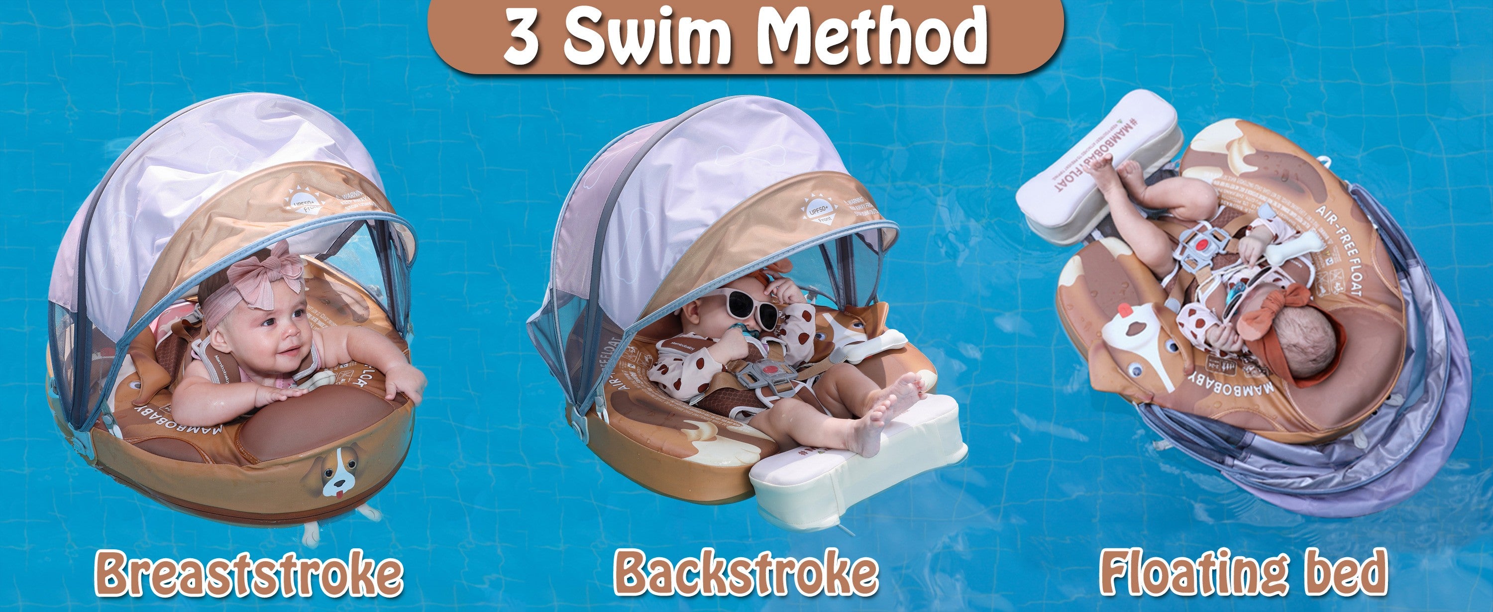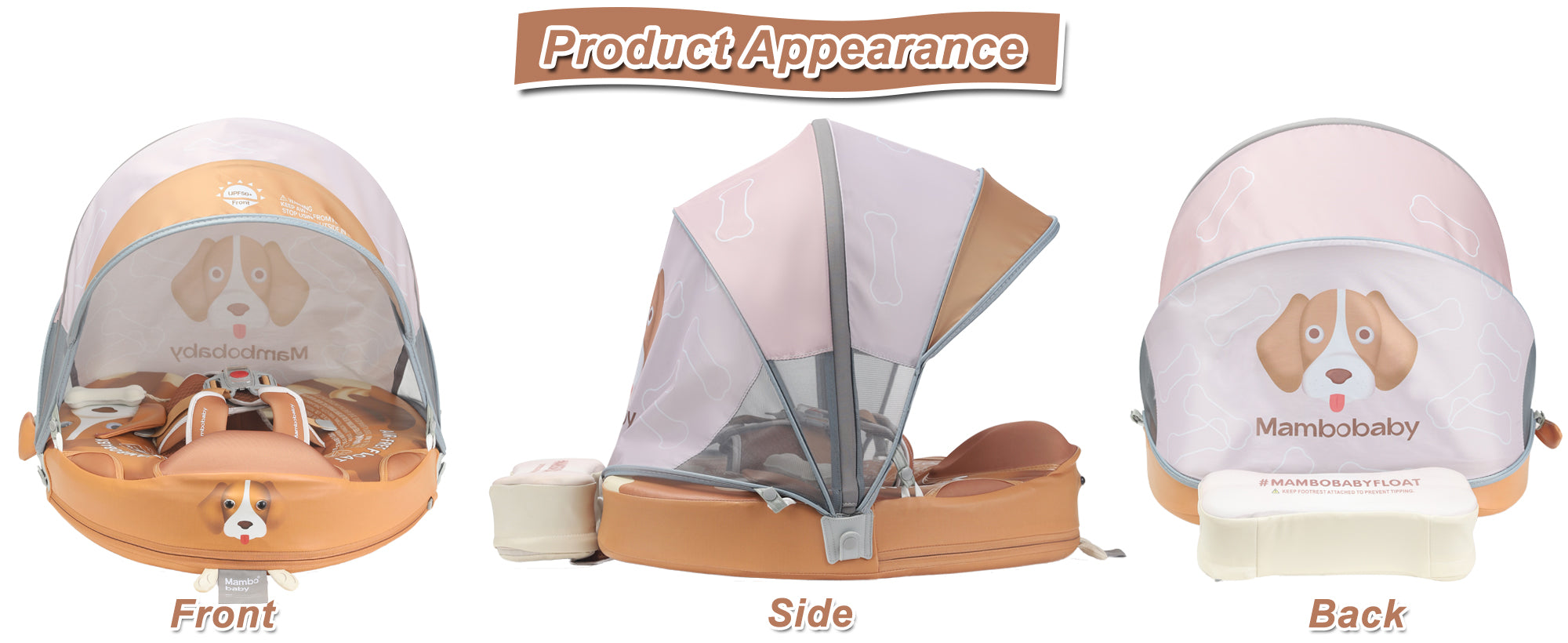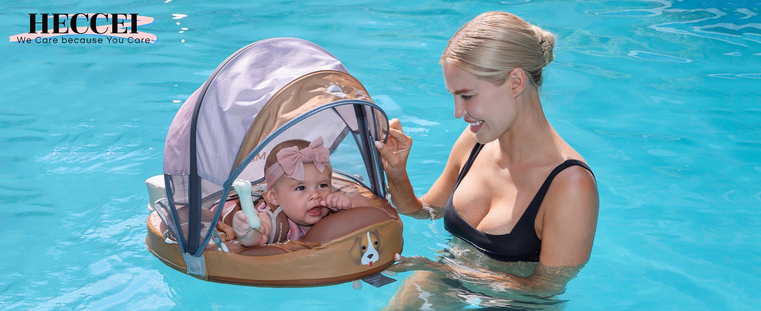 HECCEI Mambobaby Float comes with a removable canopy. The removable assemble UV-PROOF canopy sun canopy covered with UPF 50+ sunscreen coating protects baby’s skin away from the sun.