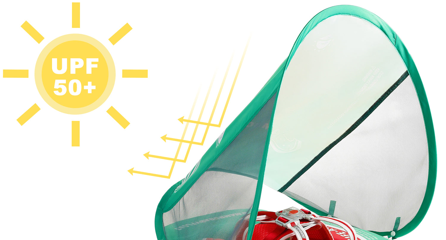 HECCEI Mambobaby Float comes with a removable canopy. The removable assemble UV-PROOF canopy sun canopy covered with UPF 50+ sunscreen coating protects baby’s skin away from the sun.